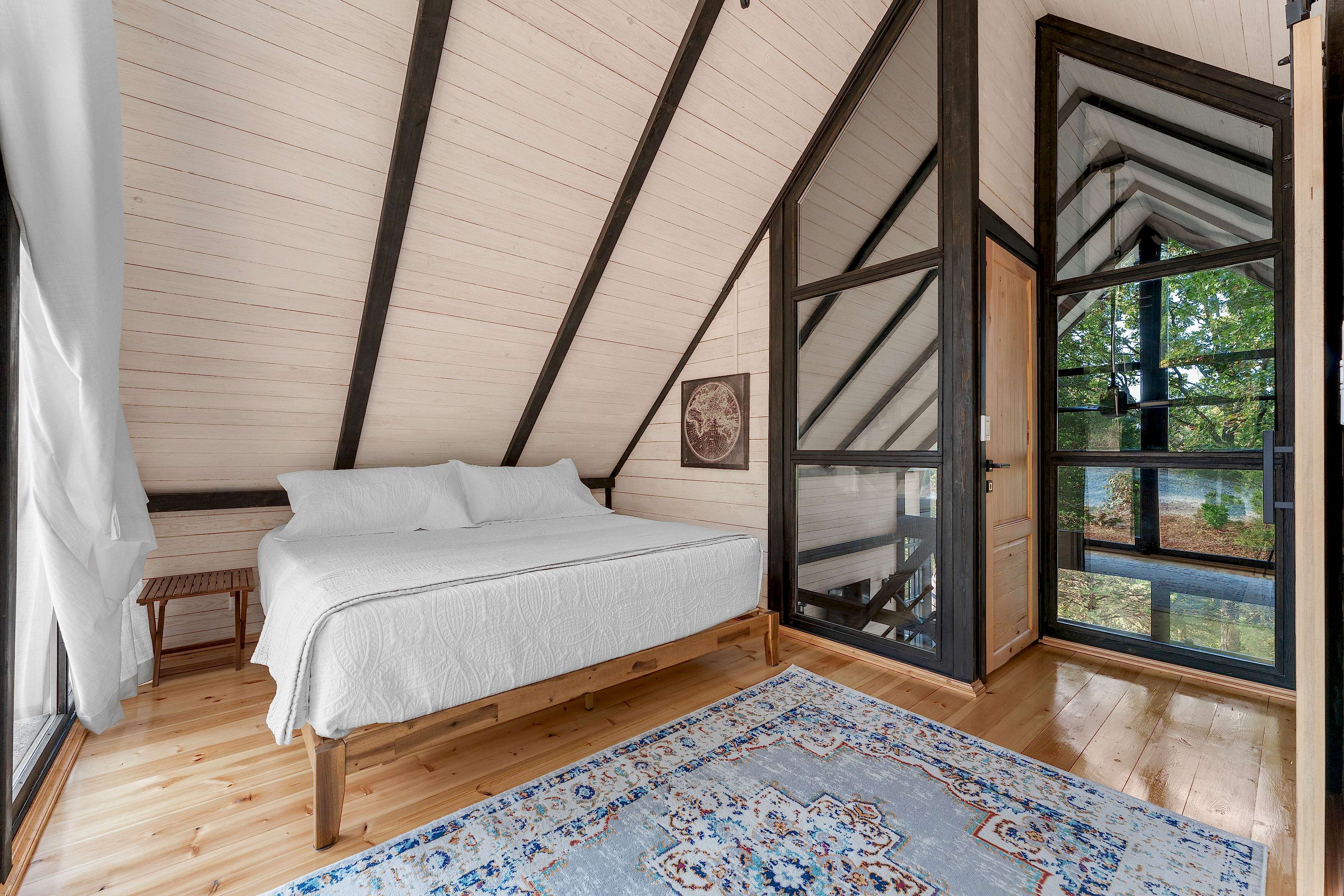 This cabin measures approximately 480 square feet (18' x 26'8'') on ground floor, with a height of 19 feet 4 inches. It features 2 bedrooms, a loft floor measuring 258 square feet (19'X13'4'' ), and includes 2 bathrooms. Additionally, there is a terrace measuring 190 square feet (19' x10' ) , offering a comfortable outdoor space.